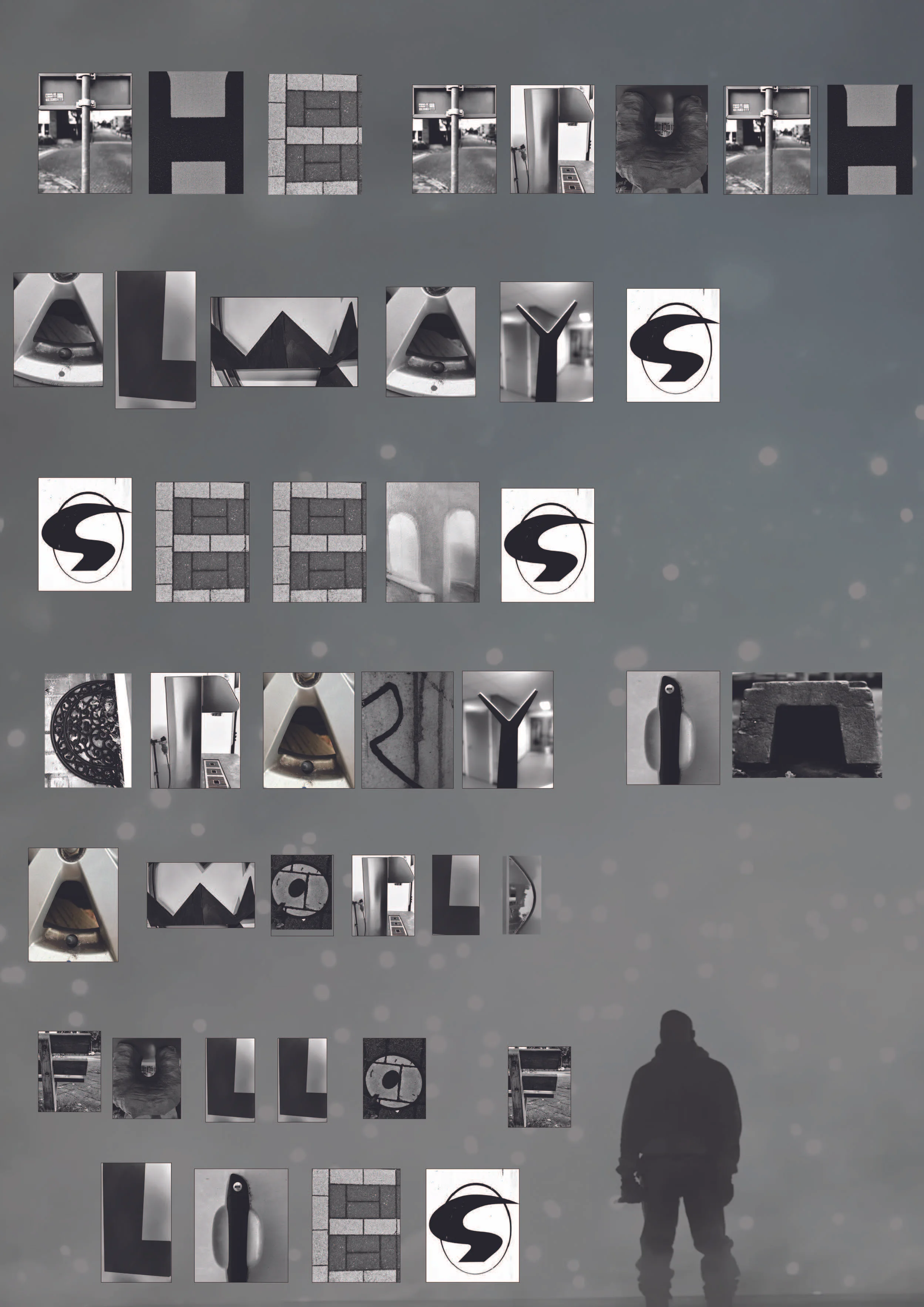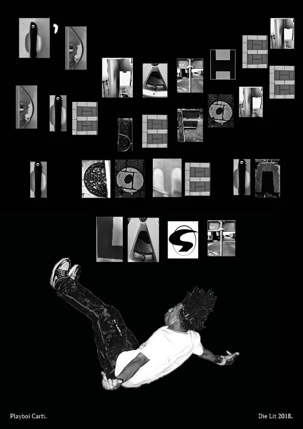 In this project I went out with a few classmates to photograph an entire alphabet and then make posters with it using famous quotes from favorite or well-known artists. This was very challenging because it is quite difficult to find some letters just out on the street. Still, we managed to find the entire alphabet and converted them to black and white, and we made a collection, from which we eventually each made individual posters, and you can see the final result here on the left. The one on the left is a quote from a song by Playboi Carti (Long Time) from the album Die Lit. I find this a very nice and inspiring album and that is why I used his lyrics. The one next to it is from Kanye West, he says here, The truth is crazy in a world full of lies. This quote reminds me that staying true to the truth sometimes means you are seen differently, but that this is not wrong.