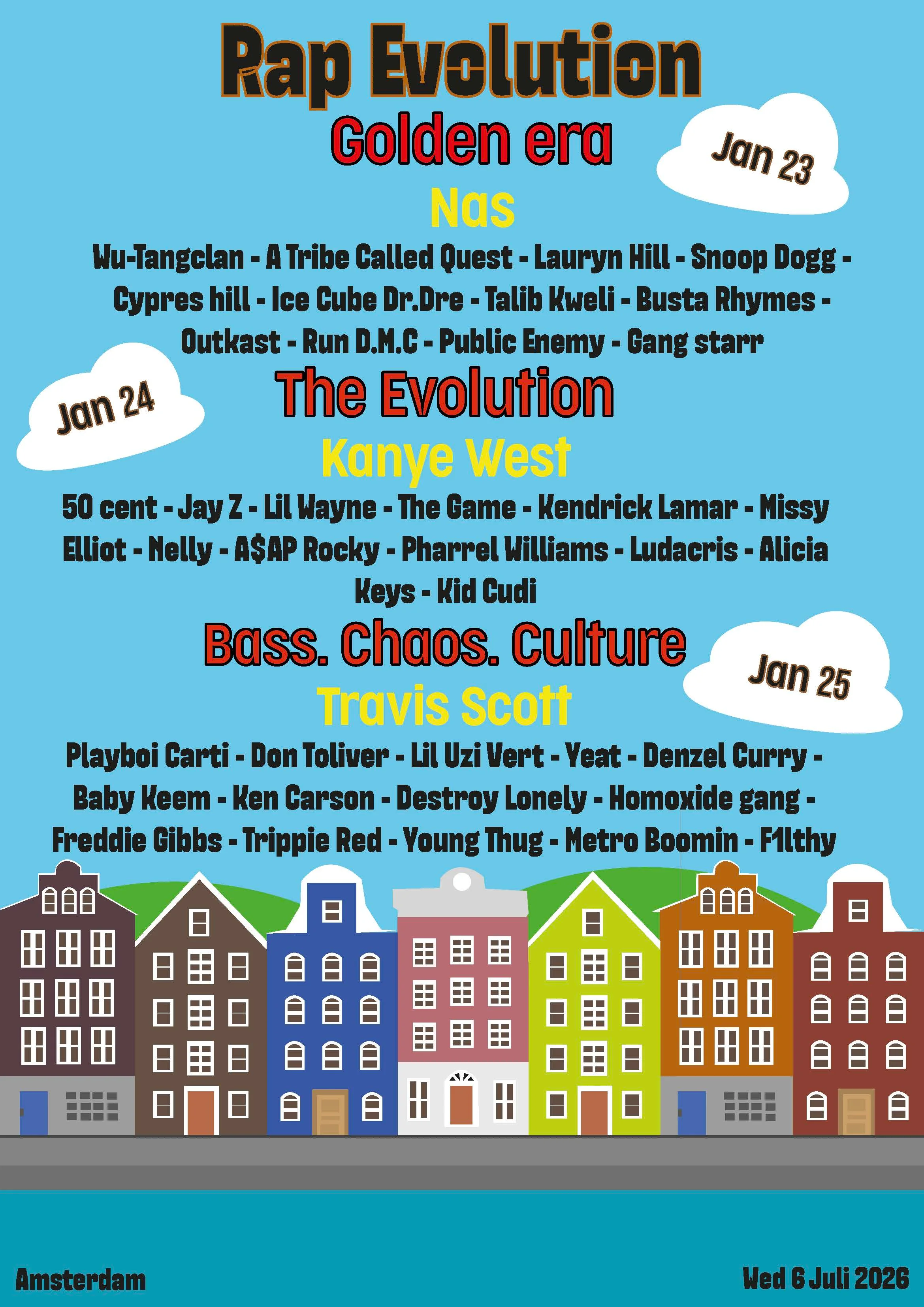 These music posters are one of my favorite projects. I wanted to create a completely different atmosphere for each poster, as you can see from the chaos of the Ken Carson poster to a more colorful Golden Age festival poster to the calm tour poster of Nas and DJ Premier. I really enjoyed making these posters because I could have a lot of my own input, especially through the music I listen to myself, as seen in the Golden Age poster where my different genres are visible in my music taste. I am also very proud of my tour poster of Nas because when I showed it to a friend, he was already really looking forward to it. Unfortunately, the outing did not happen.
