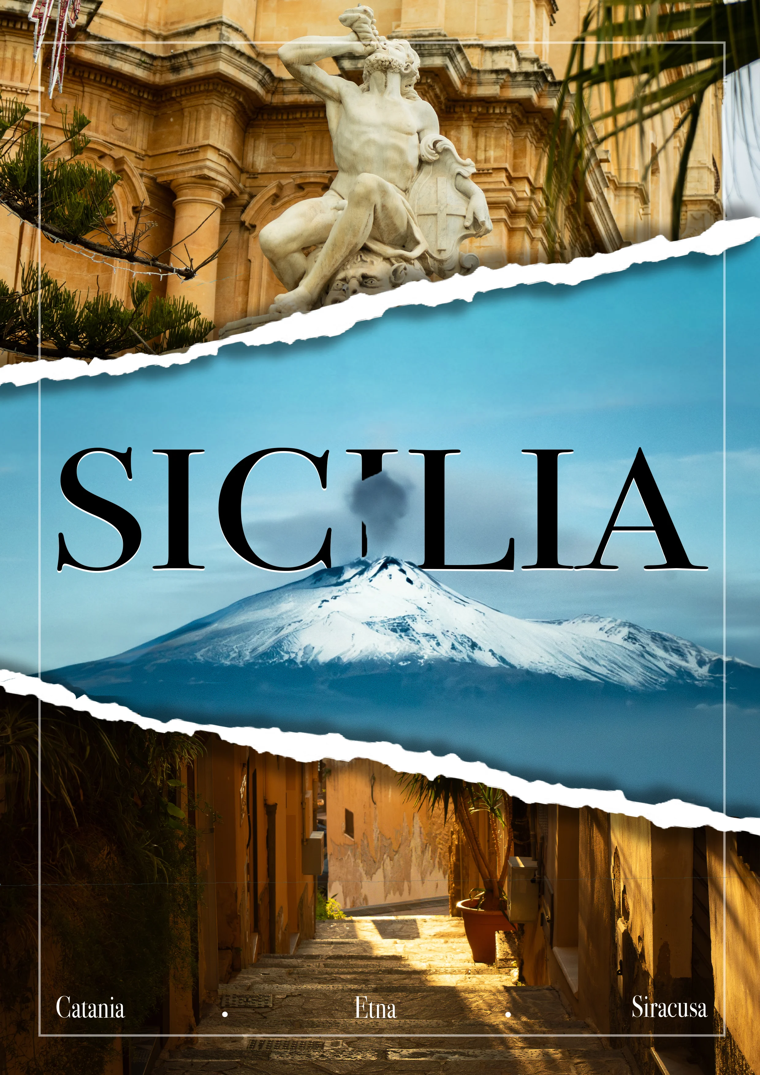 During my vacation in Sicily, I took beautiful photos of the stunning landscapes and culture. In the photos you can see the impressive Mount Etna, which had its largest eruption since 1997 at the time we were on the island, and I quickly managed to take a beautiful photo of the ash cloud. The other photos show the rich culture of the island, such as the beautifully lit streets of Syracuse and the stunning old Christian statues in Catania. I then turned these photos into stylish vacation posters that capture the culture of the island. From the super clear sea to the historical architecture, each poster tells a story of my journey.