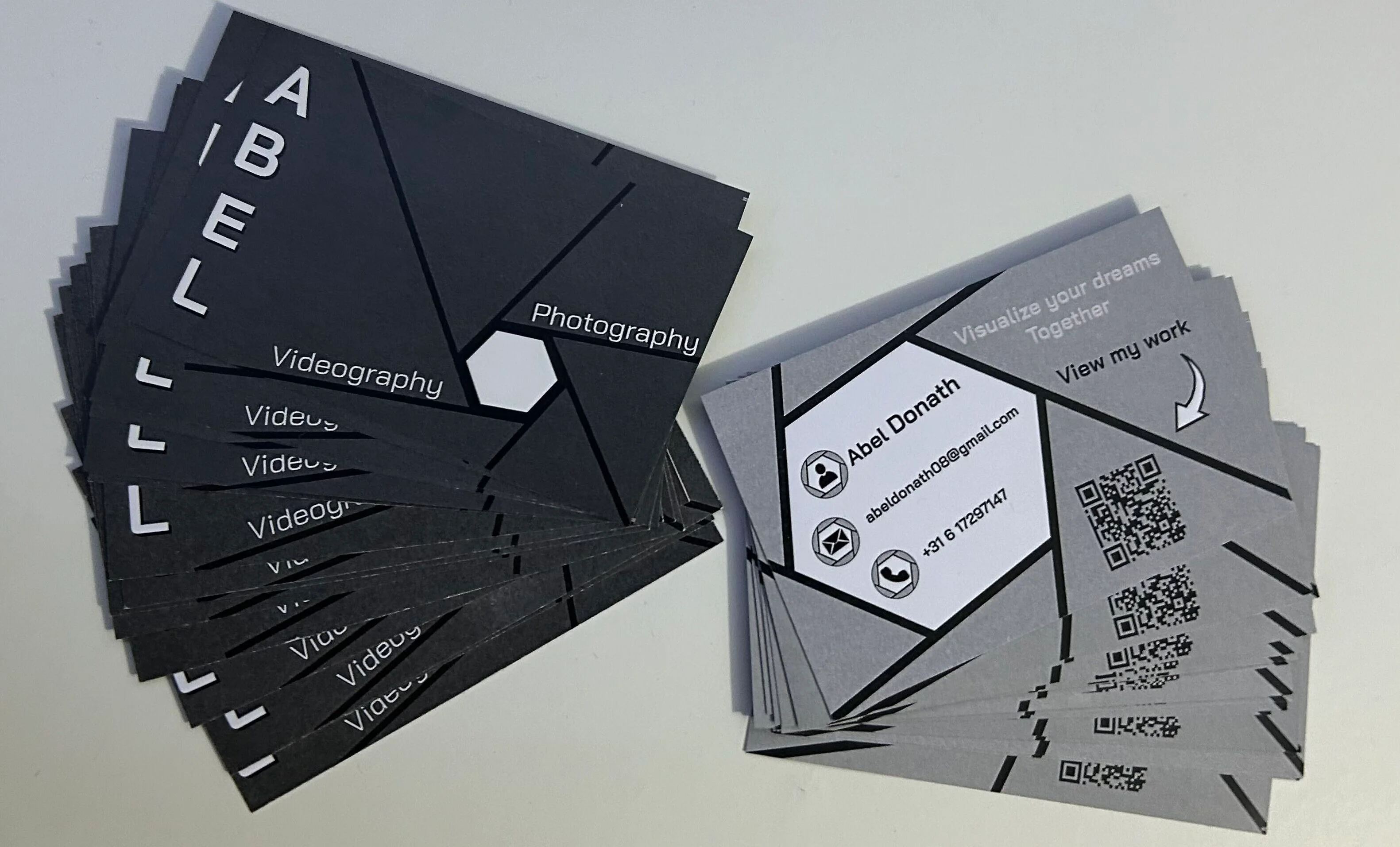 This is my own designed and made business card. This was one of the first designs I made during my education. I kept a very minimalistic design. I chose this design because I wanted a card that clearly shows what I do, but also expresses my style. You can immediately see from the front and the back that it's about a camera lens, and that just happens to be what I do. On the back is my information with a QR code to my Instagram, because at that time I didn't yet have a portfolio website, but even then I was already thinking about how people could see my work. In short, it's a simple but clean design and it shows what I can do and what I stand for.